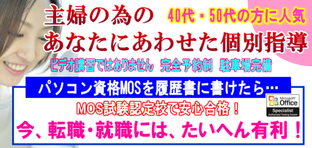 加古川市のパソコン教室エムズ(加古川・高砂・東加古川・加古郡・稲美町・播磨町)は個別指導で完全予約のパソコン教室。短期習得は、パソコン教室加古川エムズへ!就職・転職・進学・仕事の為、パソコンは必須!有利にになる短期パソコン資格MOS合格を目指しましょう。パソコン資格MOS試験合格者急増中。